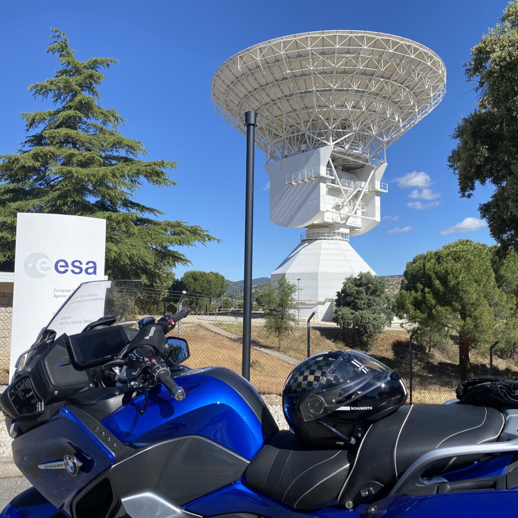 En todo viaje en moto hay distintos momentos, y este es el de disfrutar. La navegación pasa a un segundo plano; la pelea con el asfalto rugoso o la carretera estrecha queda atrás. Ahora solo toca dibujar buenas curvas y, de vez en cuando, regalarse una mirada al paisaje. Llegaremos hasta El Hoyo de Pinares y, desde allí, en pocos kilómetros, entraremos en la provincia de Madrid. Pero antes haremos la parada tradicional junto a la antena de espacio profundo que la Agencia Espacial Europea (ESA) tiene cerca de Cebreros…