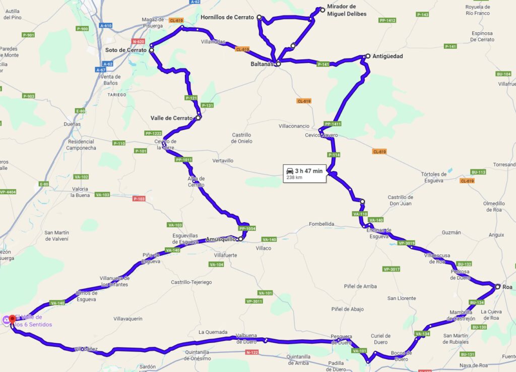 El recorrido transcurre por la comarca natural del Cerrato, cuyo nombre proviene del latín zerrato, que significa “tierra ondulada dominada por cerros”. Y realmente, esto es lo que define a la zona: una sucesión de cerros que se alternan con amplios y suaves valles, donde grandes planicies se extienden en lo alto. Esta comarca abarca territorios de las provincias de Burgos, Valladolid y, principalmente, Palencia.