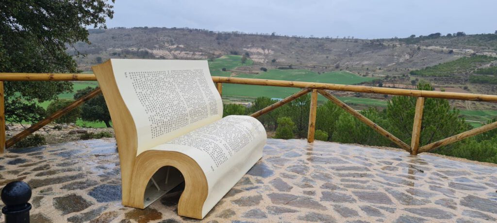 Lo primero que llama la atención es su banco con forma de libro abierto, un guiño precioso al escritor que invita a sentarse, leer unas líneas de Delibes y mirar al frente. Desde este punto se abre ante nosotros una vista amplia y serena de los campos del Cerrato, un paisaje austero y auténtico que Delibes conocía bien y que tanto marcó su obra.