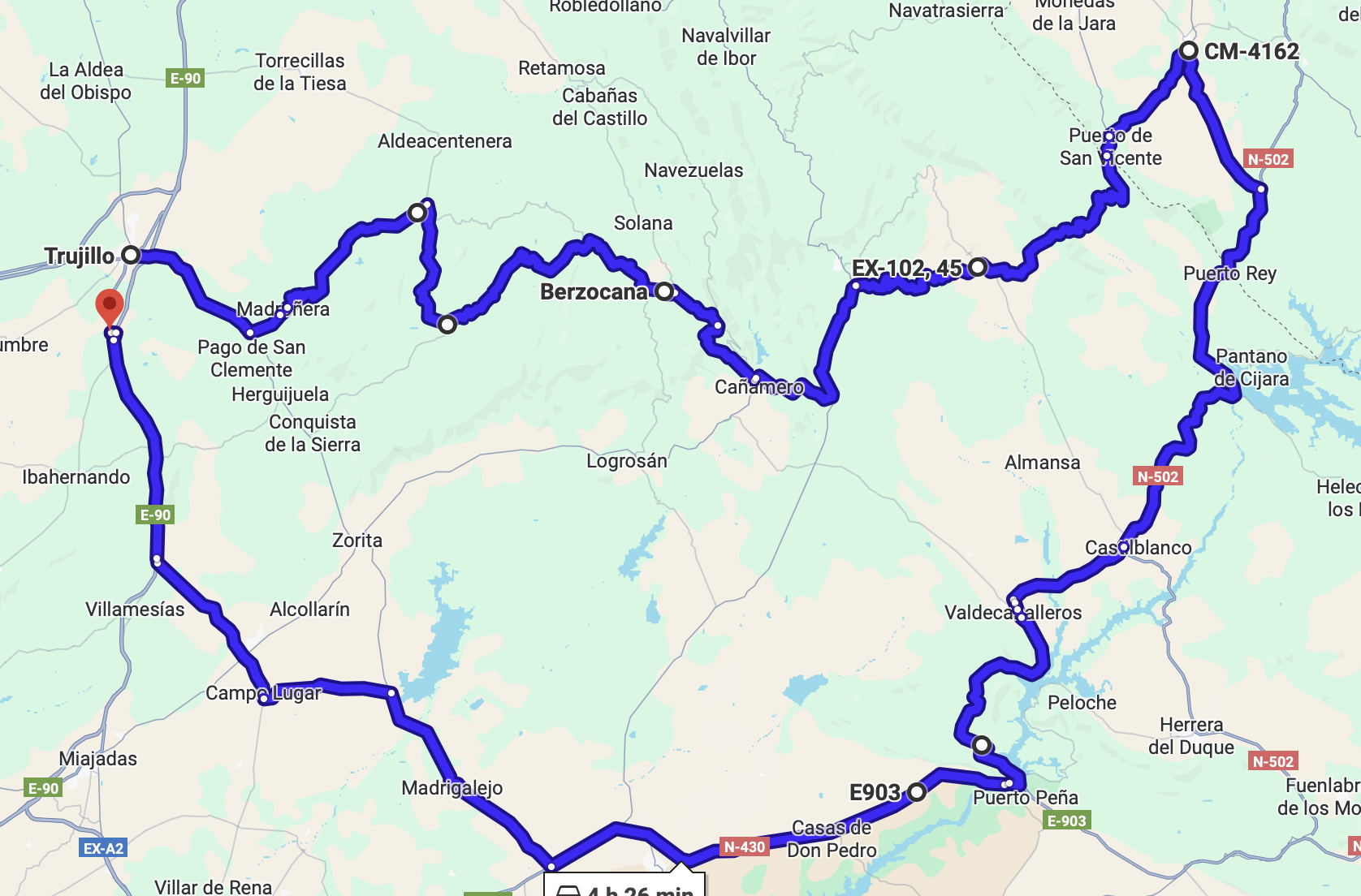 Tras el desayuno, iniciaremos una ruta por los rincones más espectaculares de Extremadura, adentrándonos en la comarca de las Villuercas y los Ibores. Esta zona, de paisajes montañosos, bosques de encinas y alcornoques, y pueblos con encanto, ofrece carreteras serpenteantes y poco tráfico, ideales para disfrutar tanto de la conducción como de la belleza natural. Cada tramo invita a descubrir vistas panorámicas y a conectar con la tranquilidad de la dehesa extremeña.